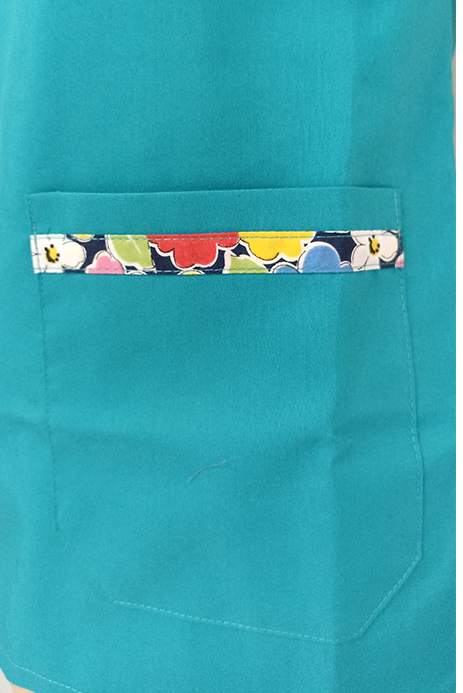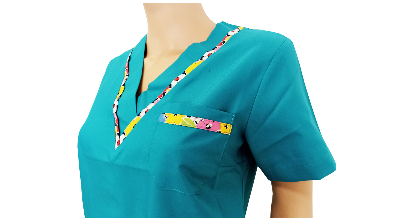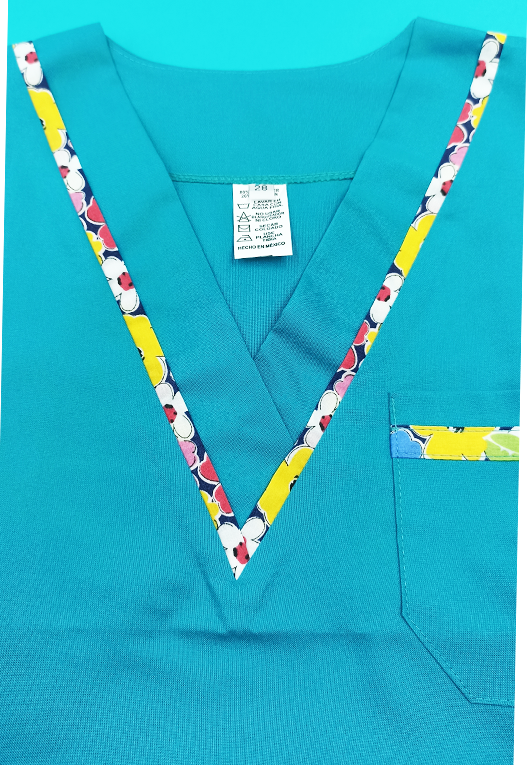 Escote en "V", con detalles en flores de colores, en manga corta,