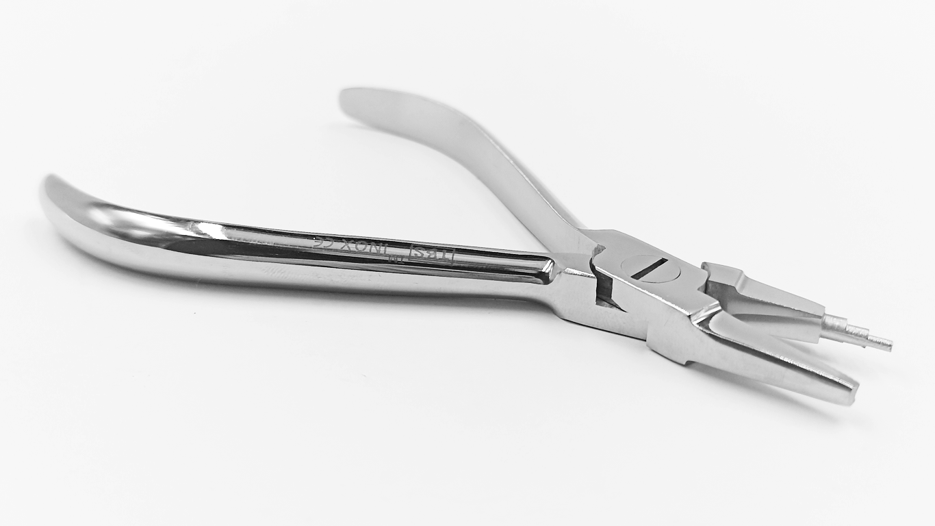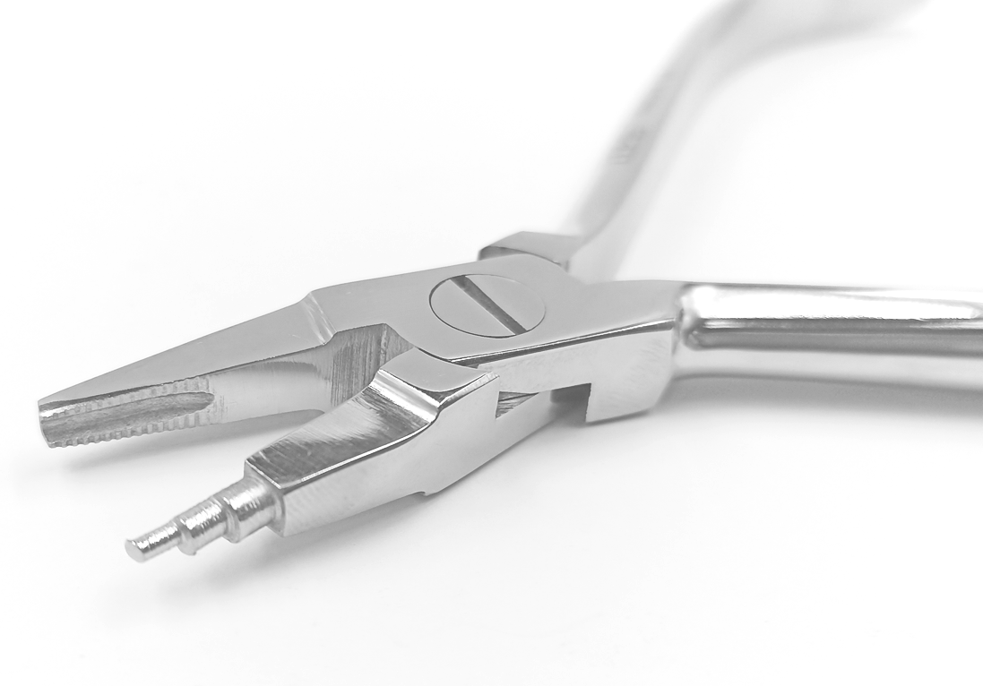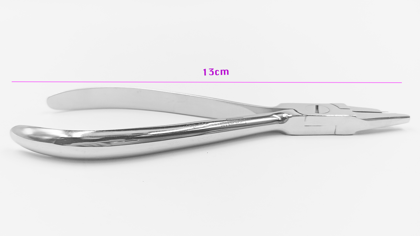 La pinza tiene una forma similar a una pinza de punta de aguja, pero con una cabeza especialmente diseñada para trabajar con alambres. La cabeza de la pinza tiene una forma curvada o en ángulo, lo que le permite acceder a áreas de difícil acceso en la boca y doblar los alambres con precisión.